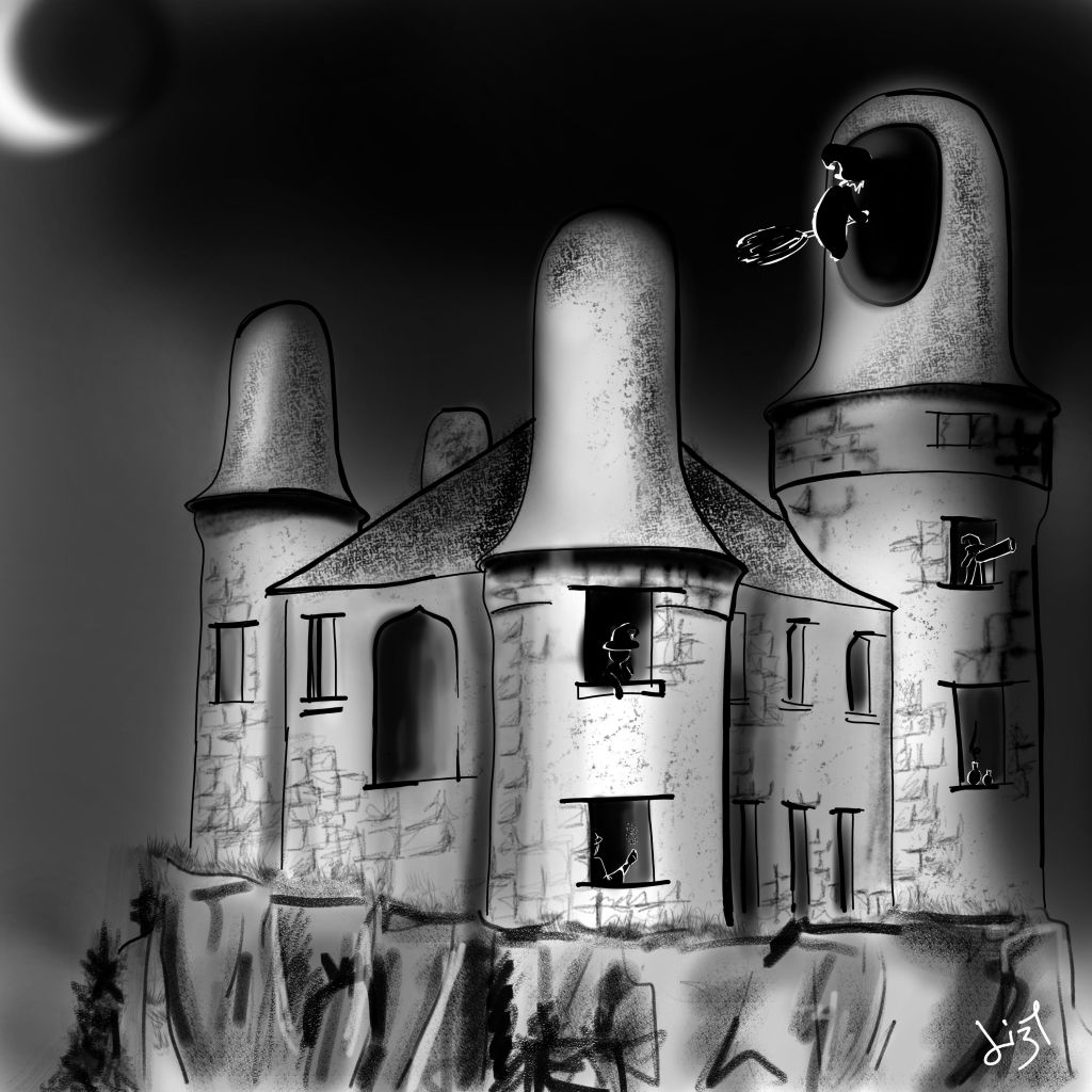L’idée du dessin d’aujourd’hui vient de mon grand fils. Nous parlions en chemin pour son activité du samedi de Marjorie et de la communauté des sorcières. De ce château, celui de Maîtresse Ada, auquel on ne peut accéder qu’à tire d’ailes ou en balai. La comtesse Ada en a fait un lieu de rencontre et de refuge pour toutes les sorcières. Elles y disposent d’espaces, de matériel, d’une grande bibliothèque, d’une machine analytique, de temps, de tranquillité et d’une exposition optimale à la lumière de la Lune.